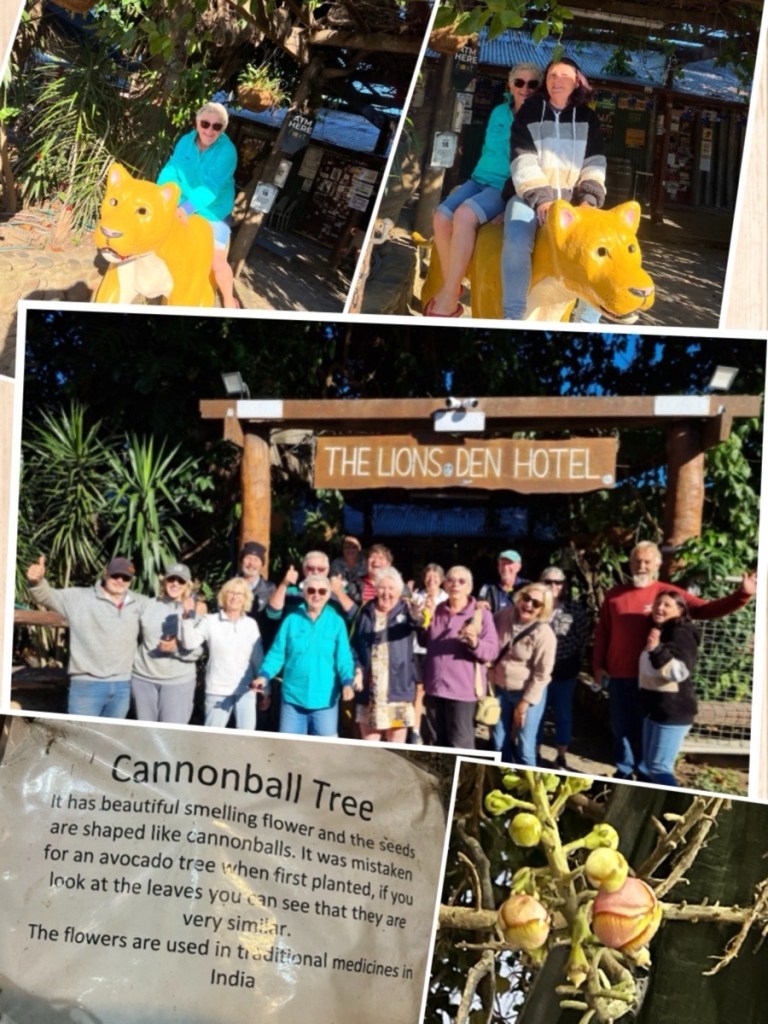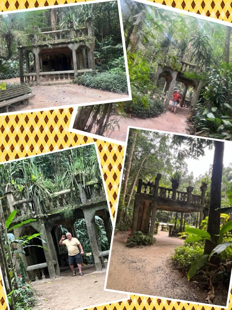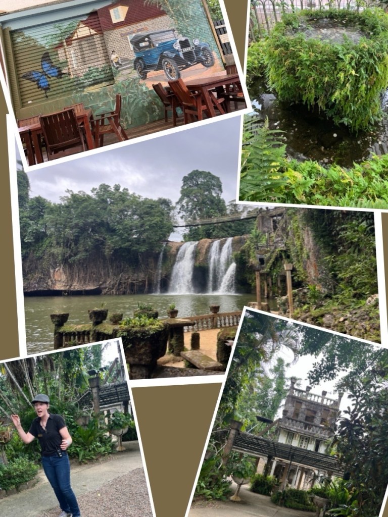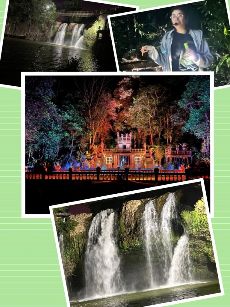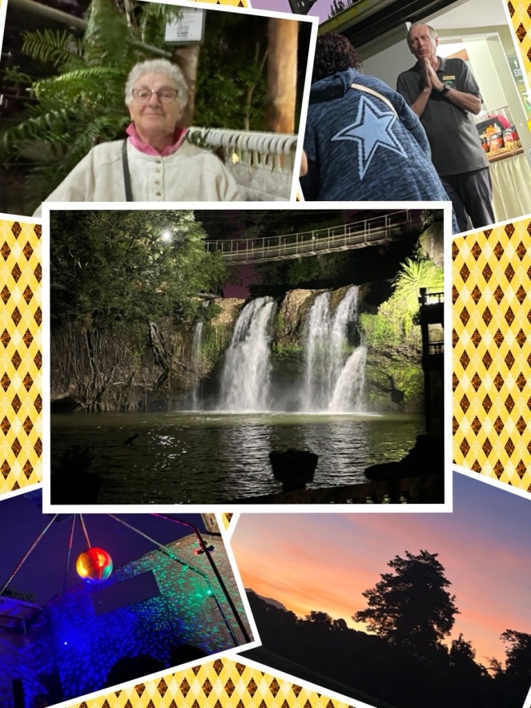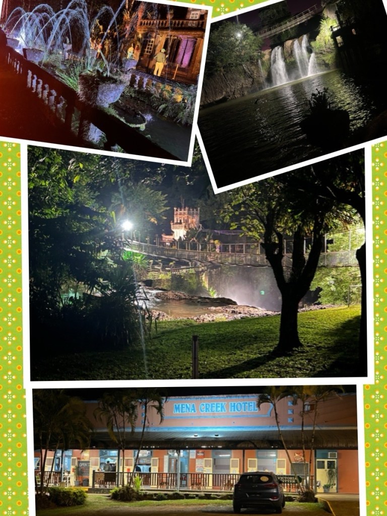 Some very interesting plants around the park. Don’t you just love the tropics.Cameron chatting with the guide, Alyssa.Look closely for the turtles, there were so many waiting for a feed.Teresa (daughter of Jose) falls and bamboo forest.Air raid shelter was put in when the family was asked to shift south and they decided to build an air raid shelter instead, after Darwin bombing. Different views of the ballroom.Mark Evan’s the owner introducing the night tour & photos of night tour.Pam giving an insight to the lighting of Paranella Park.Had to take a photo of the pub!!Selfies aren’t are forte, obviously.