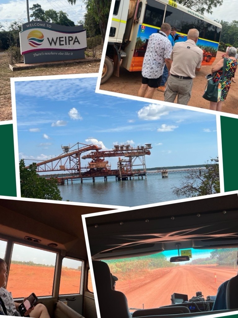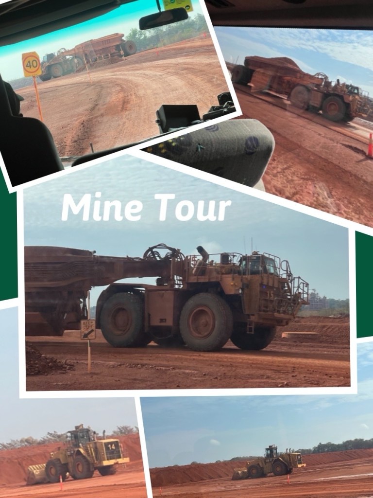 Cameron thoughts on Mine tour.2 hour bus tour around the mine and Weipa. .Bauxite mining is relatively easy compared other types. All trees to be replaced and remove from strip usual 1/2km wide and 2 metres of top soil removed to the side. Leaving the red bauxite, shovelled to belly trucks 350 tonnes to plant. After 2 to 3 metres of bauxite depth mixed replaced top soil and the trees. Mine then moves onto another area.School leavers are guaranteed work if they would like, a mine controlled town. Weipa even though a mine town there is a council that runs the town a mine person, indigenous elders and people elected by the community.