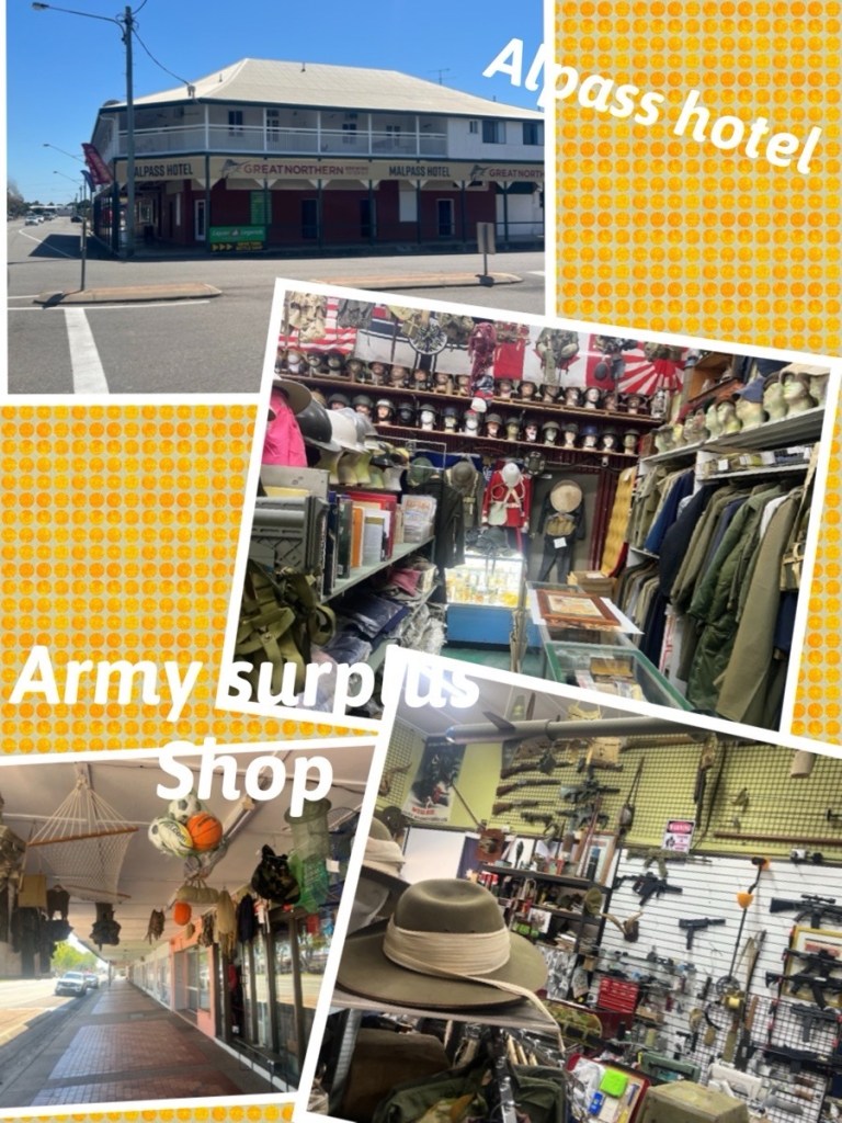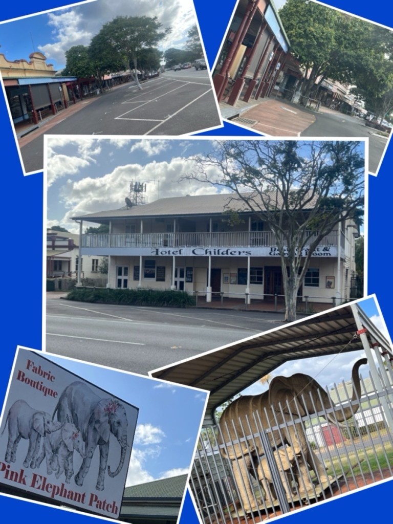 Lots of history.Toilet doors unique, a headache for Cameron after the sampling.Childers Hotel and a unique business display for fabric.Hervey Bay with the ducks all waiting for their feed.