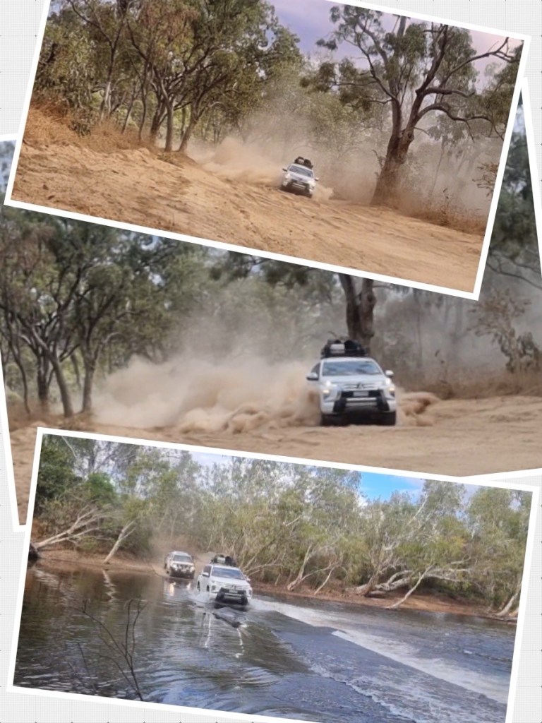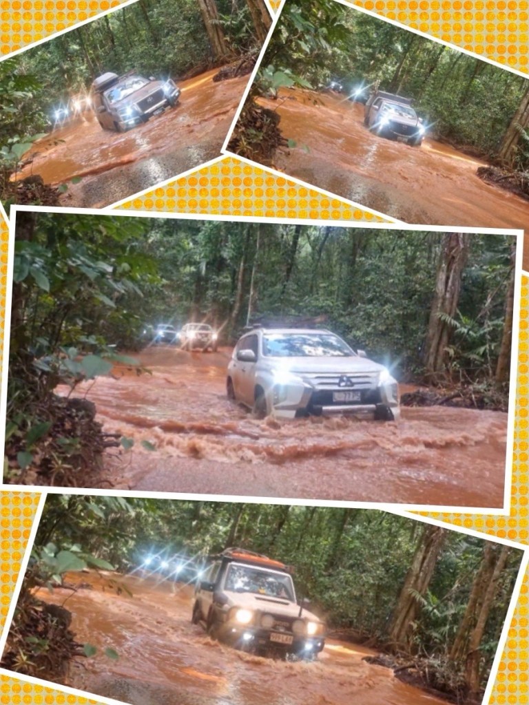 Our cars are all red from the dust and wet patches. Setup and we then go onto the Old Telegraphic Track and both of us had a go pretty scary. Deep gully to drive through the Palmer River.