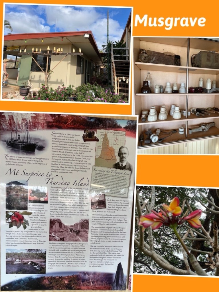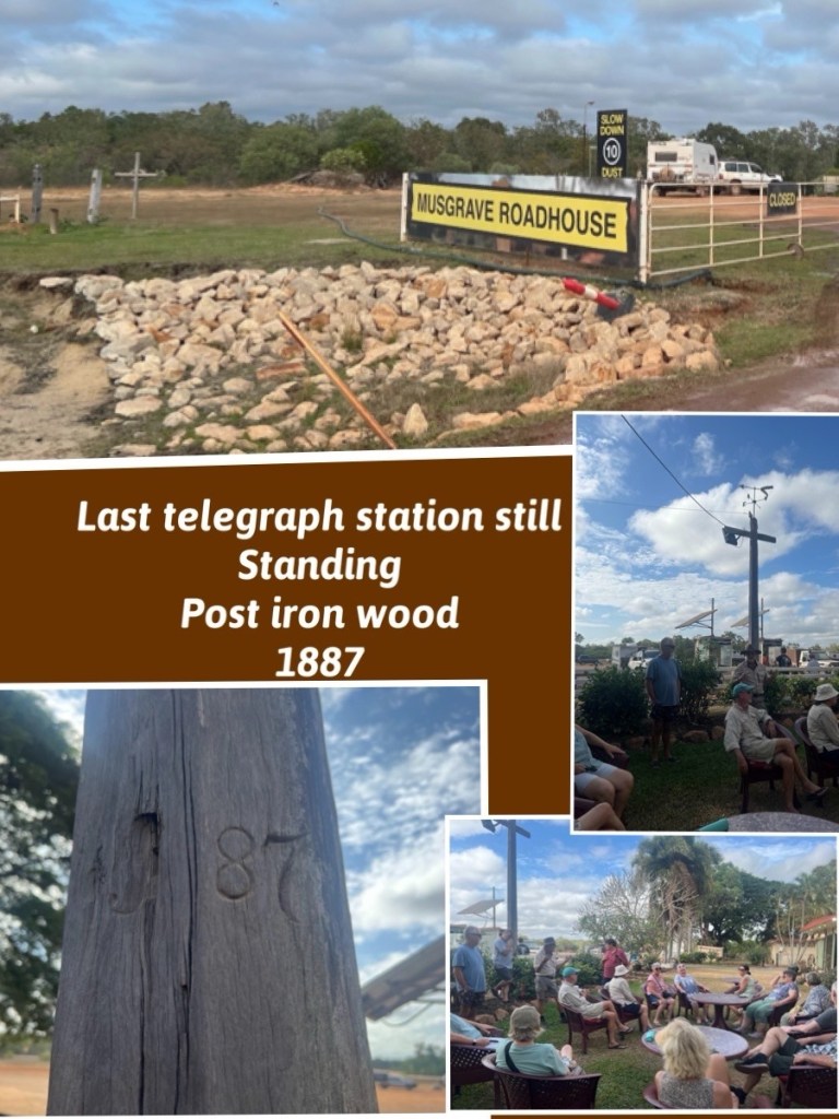 Morning Tea Musgrave Roadhouse, we see our first freshwater crocs and turtles. This roadhouse was one of the telegraph stations that is still in existence. Memorabilia and some original ceramic insulation cups left on display.