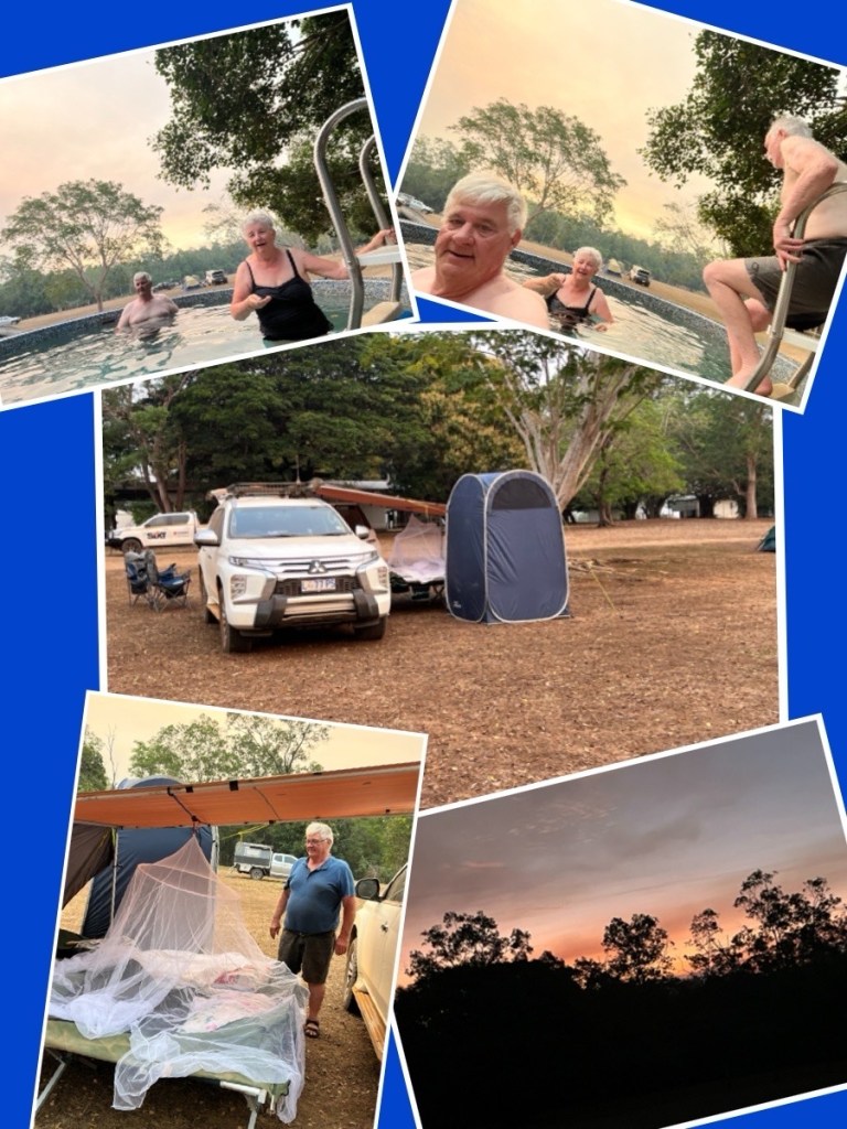 Tonight is the first night to breakout the mosquito net, getting quite warm in the swag. A quick dip in the above ground pool if that is what you call it. It was very welcoming after the warm day Meluna Station dinner cooked, silverside and roast veges pav, cheesecake and ice cream Yummo!.
