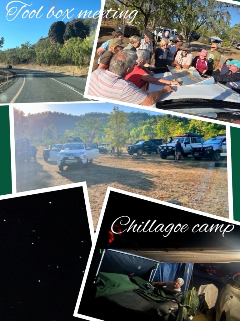 Heading out of town to Chilligoe where we are staying at the Eco Lodge but out the back in non powered site amongst the trees. First time to unpack and see what we have forgotten and try out setup. There are only 2 of us who have swags, 6 have tents and we have a single lady who has her sleeping arrangement in the back of her ute, actually probably the best set up of all.