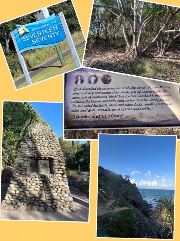 A cairn commemorates the first landing of the “Endeavour” in Queensland at Bustard Bay. It stand on the site where one of Cook’s crew carved the date on a tree near there they came ashore on the 24th May 1770.