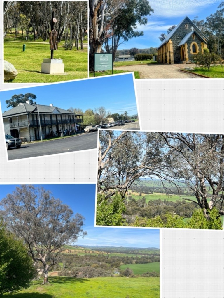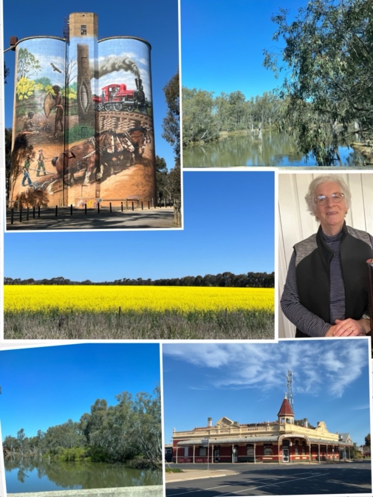 Katamatite Silo, Ovens River, Canola paddock, Cameron’s cousin , Dianne and Nathalie pub.